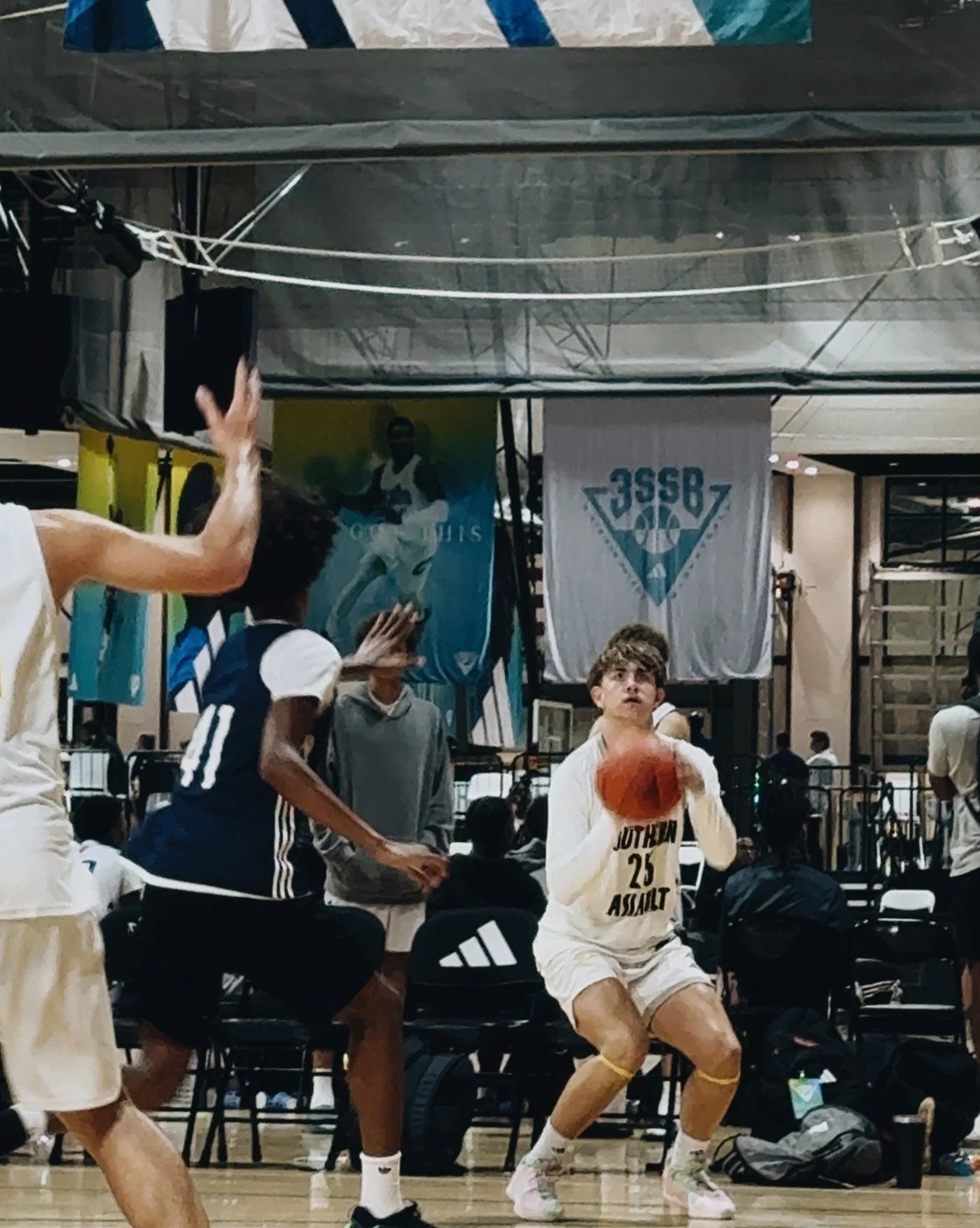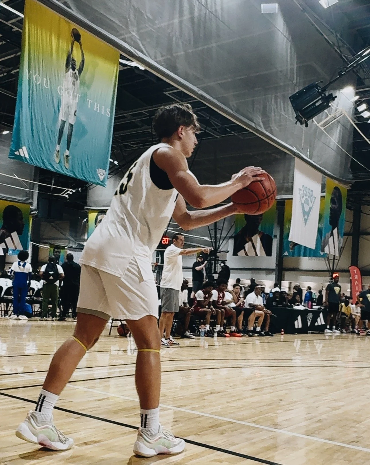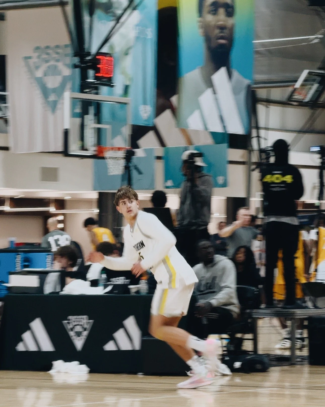 Gus Mills emerged as one of the top prospects and standout players, showcasing a well-rounded game that left a significant impression. His ability to run the floor effectively in transition led to easy layups, while his reliable shooting from beyond the arc and smooth mid-range jumper made him a consistent offensive threat. Mills demonstrated a deep offensive arsenal, including step-backs and one-legged fadeaways, highlighting his versatility. Offensively, Mills excels as a shooter, creating scoring chances through smart movement without the ball, making effective cuts, and finding open spaces. He’s also adept at handling the ball, creating his own shot, and driving to the basket. Defensively, Mills stands out with his intensity, quickness, and versatility in guarding multiple positions. His strong defensive principles, including disrupting passing lanes and forcing turnovers, coupled with his high basketball IQ and relentless motor, make him a valuable contributor on both ends of the floor. His all-around impact and ability to do the little things that help his team win set him apart as a standout player.